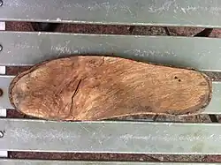 The wearing of clogs in Britain became more visible with the Industrial Revolution, when industrial workers needed strong, cheap footwear. Men and women wore laced and clasped clogs respectively, the fastening clasps being of engraved brass or more commonly steel. Nailed under the sole at toe and heel were clog irons, called calkers[2] or cokers, generally 3/8" wide x 1/4" thick with a groove down the middle to protected the nail heads from wear. The heyday of the clog in Britain was between the 1840s and 1920s and, although traditionally associated with Lancashire, they were worn all over the country, not just in the industrial North of England.[3][4] Indeed, Mark Clyndes of Walkleys says "More clogs were worn down south than in the northern industrial towns".[5] The London fish docks, fruit markets and the mines of Kent being particularly noted.[5] Clogs could be manufactured within hospitals to keep down the cost of clothing.[6] Through manufacture, repair and wear clogs could become individually recognised. In the aftermath of disasters they could be a means of identifying the victims, as happened after the Clifton Hall Colliery disaster where at least two men could only be identified this way.[7][8][9]