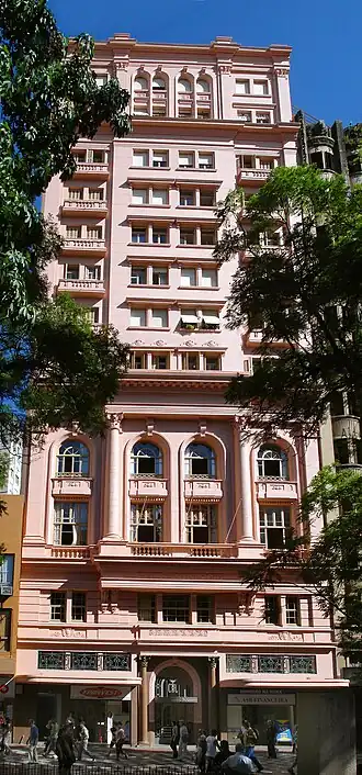 On November 7, 1930, the Centro da Indústria Fabril do Rio Grande do Sul, predecessor of Federação das Indústrias do Estado do Rio Grande do Sul (FIERGS), was founded on the site. The construction of the former Banco da Província building, now Santander Cultural, forced the members to find a new location for their own headquarters. The new building on Andradas Street, opposite Alfândega Square, surpassed in height all the other constructions in Porto Alegre. On April 19, 1937, the contract was awarded to Dahne, Conceição e Cia.; the foundation stone was laid on June 23, 1938, and the inauguration occurred on December 16, 1940. The eclectic style building with strong Art Deco predominance was called Rosado Palace. The Clube do Comércio was Revista do Globo's favorite place to show the sociability of Porto Alegre's bourgeoisie.[13][14][15][1][16][17][18]