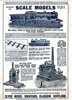 The Clyde Model Dockyard was a famous toy and model shop in Glasgow (not to be confused with the original Model Dockyard or Stevens Model Dockyard — different companies dealing in similar products). Established in 1789, it was located at 22–23 Argyll Arcade. The firm manufactured a range of boats and sailing yachts, but were probably best known for their 0 scale model railway stock and accessories.