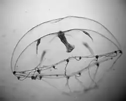 Like most Cnidarians, Clytia has relatively simple morphology. However, despite containing relatively few cell types and lacking elaborate organ structures, the medusa have much greater anatomical complexity than their polyp form. Adult medusa are on average 1 cm in diameter. They are almost entirely transparent, their gonads, radial canals, short stomach, and four-lipped mouth being their most clearly visible anatomical structures.[8] Each medusa has four gonads positioned midway along each endodermal radial canal. The gonads themselves are transparent, allowing for visualization of the oocytes within.