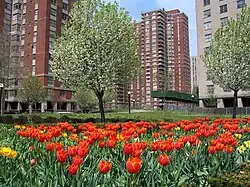 Co-op City's 15,372 residential units are composed of 35 high-rise buildings and seven clusters of townhouses, making it the largest residential development in the United States.[4] It sits on 320 acres (1.3 km2), though only 20% of the land was developed, leaving many green spaces. The apartment buildings range from 24 to 33 floors. There are four types of buildings: 10 Triple Core (26 stories high with 500 apartment units per building), 10 chevron (24 stories, 414 units), 15 tower (33 stories, 384 units), and 236 town houses. The townhouses are three stories high and have a separate garden apartment and upper duplex apartment.[5]