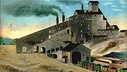 Ideally, coal breakers were placed so that the top of the breaking plant was equal to or slightly below the mine mouth so that gravity would move the coal to the breaking plant.[3][4] Where this was not possible, coal would be hoisted to the top of the coal breaking plant.[3][4] A boiler and boilerhouse would be located nearby to provide power for the hoist, moving screens, jigs, and crushers (although in more modern times this is supplied by electricity),[8] along with an engine house (to house the engine for the hoist), pumps and pumphouse (to supply the coal washing machines with water), and headframe (for the hoist).[3][4] The typical coal breaking plant was often eight or nine stories tall,[2] sometimes rising 150 feet high or more.[3][4]