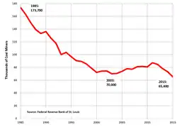 In 2018, coal mining decreased to 755 million short tons, and American coal consumption reached its lowest point in nearly 40 years.[18] In 2017, U.S. coal mining had increased to 775 million short tons.[4] In 2016, US coal mining declined to 728.2 million short tons, down 37 percent from the peak production of 1,172 million tons in 2008. In 2015, 896.9 million short tons of coal were mined in the United States,[19] with an average price of $31.83 per short ton,[20] worth $28.6 billion.[21][22]