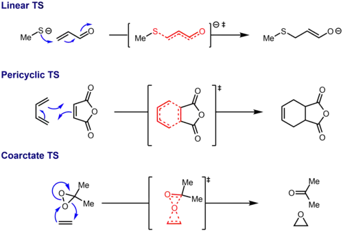 In contrast to these types of reactions, a coarctate reaction is characterized by a doubly cyclic transition state, in which at least one atom undergoes the simultaneous making and breaking of two bonds. Thus, the topology of the transition state of a coarctate reaction is a constricted cycle that meets with itself (resembling a figure eight) while the topology of pericyclic and linear reactions are a circle (or Möbius strip) and line segment, respectively. The concept was first proposed by Rainer Herges.[1][2]