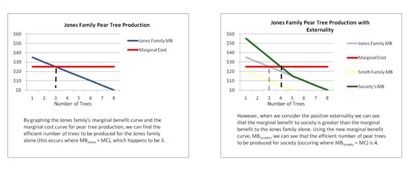 The Jones family plants pear trees on their property which is adjacent to the Smith family. The Smith family gets an external benefit from the Jones family's pear trees because they pick up whatever pears fall to the ground on their side of the property line. This is an externality because the Smith family does not pay the Jones family for utility received from gathering the fallen pears and, therefore, does not participate in the market transaction of pear production. It results in the pears being underproduced, which means too few pear trees are planted.