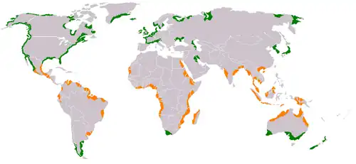Vegetated coastal ecosystems occur throughout the world, as illustrated in the diagram on the right. Seagrass beds are found from cold polar waters to the tropics. Mangrove forests are confined to tropical and sub-tropical areas, while tidal marshes are found in all regions, but most commonly in temperate areas. Combined, these ecosystems cover about 50 million hectares and provide a diverse array of ecosystem services such as fishery production, coastline protection, pollution buffering, as well as high rates of carbon sequestration.[26][25]