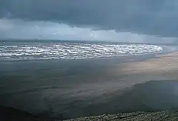 If the coast suddenly changes direction, especially around an estuary, spits are likely to form. Long shore drift pushes the sediment along the beach but when it reaches a turn as in the diagram, the long shore drift does not always easily turn with it, especially near an estuary where the outward flow from a river may push sediment away from the coast. The area may also be shielded from wave action, preventing much long shore drift. On the side of the headland receiving weaker waves, shingle and other large sediments will build up under the water where waves are not strong enough to move them along. This provides a good place for smaller sediments to build up to sea level. The sediment, after passing the headland will accumulate on the other side and not continue down the beach, sheltered both by the headland and the shingle.