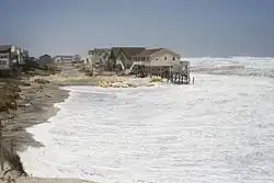 Almost all storms with high wind and water cause erosion along the coast. Erosion can occur along shore currents due to tides, sea level rise and fall, and high winds. Larger amounts of erosion cause the coastline to degrade at a faster rate and can destroy areas of habitation, leaving less land to develop or preserve. Coastal erosion has been increasing over the past few years, and it is still on the rise, making it a major coastline hazard. In the United States, 45 percent of the coastline is along the Atlantic or Gulf coast, and the erosion rate per year along the Gulf coast is currently at six feet a year. The average rate of erosion along the Atlantic is around two to three feet a year. Even with these findings, erosion rates in specific locations vary because of various environmental factors such as significant storms that can cause major erosion upwards of 100 feet or more in only one day.[15]