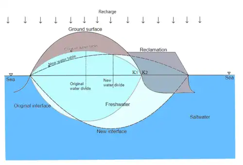 Land reclamation is a way to create flat land in coastal areas for coastal urban development. Reclamations affect regional groundwater flow systems, the location of groundwater discharge zones, seepage zones, groundwater divide, the interface between seawater and fresh groundwater and the water chemistry.[5][2] It takes years to decades to reach a new equilibrium after reclamation.[5]