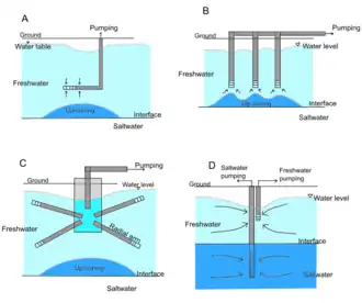 Pumping of groundwater from a well near the interface could cause seawater up-coning where seawater intrudes vertically to the aquifer.[21][22] When the pumping rate exceeds the maximum pumping rate or critical pumping rate, seawater would be pumped out.