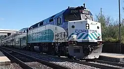 In June 2018, the North County Transit District (NCTD) Board approved the purchase of five Siemens SC-44 Charger locomotives to replace their existing five F40PHM-2C locomotives that were remanufactured by Morrison-Knudsen, with $10.5 million of the estimated $53.9 million cost earmarked from statewide gas tax and vehicle registration fees.[34] In June 2019, the NCTD Board approved the purchase of two additional SC-44 locomotives to replace two EMD F59PHI locomotives; they are due for delivery in late 2022.[35] In September 2020, the NCTD Board approved the purchase of two more SC-44 Chargers, for a total of nine; planned for delivery in April 2023, they will be used to expand service.[36][37] Deliveries of the first five Siemens SC-44 Charger locomotives took place from August–October 2020; they began revenue service on February 8, 2021,[38][39] the same day Coaster retired their five F40PHM-2C locomotives. Two locomotives were donated; 2103 to the Pacific Southwest Railway Museum, and 2105 to the Southern California Railway Museum.[40]