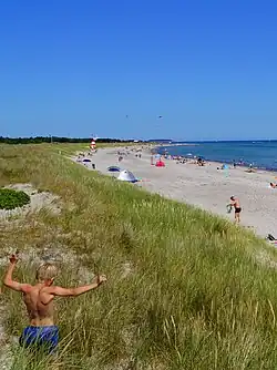 The coastline of Djursland in Denmark is 260 kilometers long as measured from the ferry berth in Voer in the middle of Randers Fjord ending at Avlsgård in Aarhus Bay to the south.[1] There are 18 sandy beaches for swimming along the coastline according to the folder, Kystkort Djursland (Coastal Map Djursland) published by the peninsula's two municipalities, Norddjurs and Syddjurs.[2] These beaches cover 15 – 20%. of the total coastline.[1] The remaining 200 plus kilometres are mostly unspoiled coastal nature.