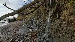Djurslands east coast protrudes into the Kattegat Sea, with a tendency to coastal erosion where the land sticks furthest out into the Kattegat sea. Here hills and slopes are gradually washed away.[4] This is the case at Gjerrild Klint to the north, Havknude south of Grenå, the Helligkilde-headland at Glatved Beach and down from Rugård Castle by Rugård Wood.[4] At Rugård one can see a wooded hill consisting of ball clay with large tilted beech trees sliding into the sea.[4]