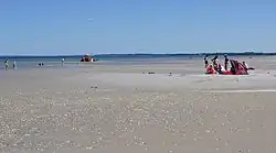 Of the northern beaches St. Sjørup is closest to mainland Jutland. It's located where the coast of Djursland turns up towards Jutland 7 kilometers before Randers Fjord.[1] One can wade out to the semi permanent sand bar 400 metres out. At St. Sjørup the transition between land and sea consists of often lush salt tolerant vegetation. Often in tussocks going into the sea without any transition in the form of a beach. St. Sjørup is probably one of the least known of Djursland's beaches, even though it might be seen as the most interesting from a nature area point of view, with wadden sea vegetation, and a wide and long sandbar out in the water, that has some of the classical sandy beach virtues for beach goers.[8]