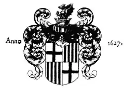 Quarterly, first and fourth Argent, a full cross Gules, second and third Or, with four paletts Gules; for a Crest, a royal crown (with half-arches, monde, and cross).