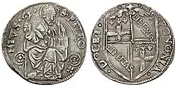 The modern coat of arms started to appear on the Bolognese coins during the reign of Sante Bentivoglio, after which the blazon was changed by the other reigning families to include their coat of arms, but the changes never stuck to the emblem.