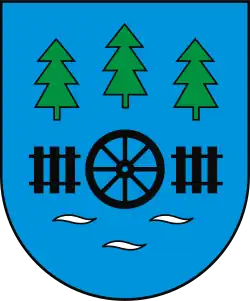The current coat of arms of Czersk consists of an Iberian style escutcheon (shield) with square top and rounded base, with the aspect ratio of its height to its width equal 7:6. The shield is divided horizontally into two fields, a white (silver) on the top, and blue on the bottom. On the white field are placed horizontally three spruce trees, while within the blue field are three small white (silver) wavy lines, stylized to look like waves on the water. In the centre of the coat of arms, on the boundary of two fields, is placed a black water wheel, and to its right, and its left, are black water dams.[1]