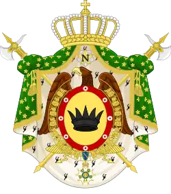 Overall an inescutcheon bearing: Or an iron crown radiant, on a bordure Gules eight plates Argent. The shield encircled by the collar of the Légion d'honneur on the breast of an imperial eagle Or, within a mantle Vert lined Ermine, crowned by a royal crown Or.[8]