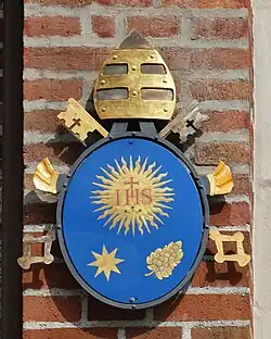 His coat of arms displays three charges on a Azure (blue) field. In reference to Francis being a Jesuit, the uppermost charge is the emblem of the Society of Jesus.[1] The emblem is composed of a Sun radiant, within which is the IHS christogram (a monogram of the Holy Name of Jesus) in red, with a red cross surmounting the H and three black nails below the H.[1]