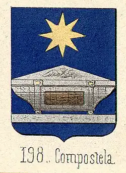 - ^ Citing the source in Galician "… o escudo de Santiago de Compostela está conformado por dos cuarteles, el derecho con las armas de Galicia, cáliz con Sagrada Hostia con siete cruces periféricas; y el izquierdo con sepulcro del Apóstol en mármol banco, con forma de arqueta sobre nubes, y en lo alto una estrella de oro radiante; sobre el escudo, una corona de los Reyes Católicos, por detrás, la Cruz Espada de Santiago.. Título I, artículo 3, Ley de Estatuto de Capitalidad de la ciuad de Santiago de Compostela."—Art. 3º , Tít.1º, del Estatuto de Capitalidad de la ciudad de Santiago de Compostela. [1]