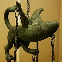 The antiquity of the modern Smolensk coat of arms was for some time presumed to be evidenced by the copper Smolensk pulo,[5][19][49] a Smolensk coin dated 1387-1404 bearing an image of a bird on a cannon. This coin was first published in the numismatic table of the Göttingen Library in 1777. Images of the pulo were presented in a number of works, and in the final quarter of the 19th century it was included in the collections of numismatists.[19] However, in 1974, historian I. G. Spassky proved[49][68] that the Göttingen drawing was the result of an erroneous reconstruction of the image of a winged and tailed harpy[19] (siren)[69] and the inscription "poulo Moscow" on the defective Moscow pulo, and that the coins in the collections were in fact fakes. This conclusion was subsequently corroborated by the findings of an expert examination of the metal used in the coins.[19]