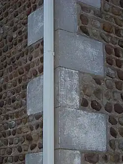 The walls of the two-story structure are made with rounded field stones between limestone quoins that both decorate and stabilize the walls.[2] The multi-colored field cobbles are held in place with limestone mortared "V" joints, typical of cobblestone construction of the Middle Period.[4] The quoins are twelve inches (300 mm) high, and there are three to four courses of cobblestones for each quoin. The house is laid out with two windows on either side of a central entrance. The one-story porch outside the front door has Victorian details under a hip roof. The Greek Revival features of the entrance include square pilasters and half side-lights. The builder and/or architect is not known.[2]