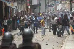 Social unrest in Cochabamba involved violent clashes between supporters and opponents of Cochabamba Prefect Manfred Reyes Villa in the departmental capital city of Cochabamba, Bolivia, reaching their peak on January 11 and 12, 2007. The policies of the President Evo Morales and the agenda of his Movement towards Socialism (MAS) party in the Constituent Assembly were opposed by politicians in other political parties, notably Reyes Villa. The prefect's opposition to Morales' policies angered the President's supporters, and early in 2007 demonstrations in Cochabamba escalated into violent clashes between Reyes Villa's civic movement and urban and rural social movements who called for his ouster. During the violence, coca farmer Juan Tica Colque (age 38) and the young student Christian Urresti (17) were killed. Coca farmer Luciano Colque (48) was mortally wounded by blows from civic movement protesters and died of cranial trauma on February 27.[1] Some 200 people were wounded in the clashes.[1]