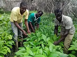 Cocoa flourishes in areas that are not more than 20 degrees north or south of the equator.[8] The trees respond well in regions with high temperature and distributed rainfall. In Nigeria, the cocoa tree is grown from seedlings which are raised in nurseries, when the seedlings reach a height of 3 cm they are transplanted at a distance of 3 to 4 meters. The cultivation of cocoa is done by many smallscale farmers on farmlands of around 2 hectares while export is dominated by a few firms.[9]