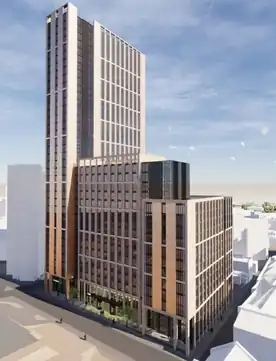 Code Sheffield is an under-construction skyscraper[a] located at the junction of Wellington Street and Rockingham Street in Sheffield, South Yorkshire. Construction commenced in March 2022[1] as part of the Heart of the City 2 redevelopment of this area of the city centre. With an originally planned height of 117 metres (384 ft) once completed, Code Sheffield would have overtaken both the St Paul's Tower as the tallest building in Sheffield and Altus House in Leeds as the tallest building in Yorkshire.[1] However, due to rising costs the planned height of the building was reduced from 38 to 26 storeys.[2]