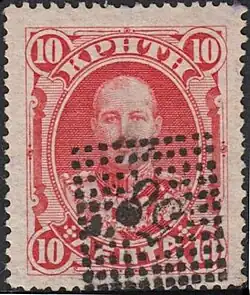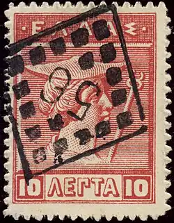 The post office of the Cretan State supplied every rural postman with a numerically coded obliteration. They were of diamond shape and were used from 1900 to 1907 to cancel the stamps on letters collected by the postman. Philatelic literature distinguishes four types of postmarks based on the number of dots per side (11, 12, 13 or 18). [13]