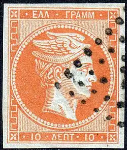 The Hellenic Post Office introduced numerically coded postal obliterations in October 1861, with the introduction of the first postage stamps. They were of rhombic (diamond) shape with the number of the post office at the center. In philatelic publications they are classified as Type I Classic Postmarks. A total of 150 different numbers can be found. The Type I obliterations were withdrawn in January 1881, so they are found only on Large Hermes definitives and on the first two issues of postage due stamps (1875/1876) of the period. [11]