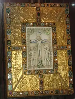 The front cover of the manuscript is an Ottonian treasure binding which dates from about 50 years before the manuscript; the metalwork is attributed to the Trier workshop set up by Egbert, Archbishop of Trier. It centres on an ivory plaque showing the Crucifixion of Jesus, which is stylistically different from the other elements, and whose origin has been the subject of much discussion.[13] The plaque has traces of blue paint on the cross and green paint highlighting some parts of the composition.[14]
