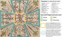 The Codex Fejérváry-Mayer is an Aztec Codex of central Mexico. It is one of the rare Native American manuscripts that have survived the Spanish conquest of the Aztec Empire. As a typical calendar codex tonalamatl dealing with the sacred Aztec calendar – the tonalpohualli – it is placed in the Borgia Group. It is a divinatory almanac in 17 sections. Its elaboration is typically pre-Columbian: it is made on deerskin parchment folded accordion-style into 23 pages. It measures 16.2 centimetres by 17.2 centimetres and is 3.85 metres long.[1]