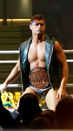 On July 19, 2016, Rhodes announced that he would appear at Ring of Honor's (ROH) Final Battle pay-per-view on December 2. ROH made the official announcement the following day.[190] At the event, Rhodes, who was simply billed as Cody, defeated Jay Lethal following a low blow, then proceed to attack Lethal, senior referee Todd Sinclair, taunted ROH fans and shoved ROH commentator Steve Corino.[191] On the January 18 episode of Ring of Honor Wrestling, Cody defeated Corino.[192] At the Supercard of Honor XI event on April 1, Cody was defeated by Jay Lethal in a Texas Bullrope match. Later in the night, he attacked former ROH World Champion Christopher Daniels.[193] On May 12 at War of the Worlds, Cody unsuccessfully challenged Christopher Daniels for the ROH World Championship in a three-way match also involving Jay Lethal.[194] On June 23 at Best in the World, Cody defeated Daniels to become the new ROH World Champion, marking the first world title of his career.[195] Cody was also billed as the first member of the Rhodes family to capture a world title in 31 years.[196] Cody and Dusty are the second father-son combination to win major world championships in the United States after Fritz and Kerry Von Erich.[197]