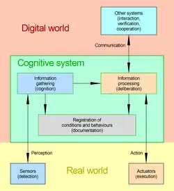 Basic scheme of a cognitive system. With sensors, such as keyboards, touchscreens, cameras, microphones or temperature sensors, signals from the real world environment can be detected. For perception, these signals are recognised by the cognition of the cognitive system and converted into digital information. This information can be documented and is processed. The result of deliberation can also be documented and is used to control and execute an action in the real world environment with the help of actuators, such as engines, loudspeakers, displays or air conditioners for example.