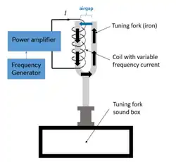 The resonance effect of magnetic vibration with a structural mode can be illustrated using a tuning fork made of iron. A prong of the tuning fork is wound with a coil fed by a variable frequency power supply. A variable flux density circulates between the two prongs and some dynamic magnetic forces appear between the two prongs at twice the supply frequency. When the exciting force frequency matches the fundamental mode of the tuning fork close to 400 Hz, a strong acoustic resonance occurs.