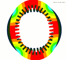 As an example a resonance with the elliptical modal shape of the stator can occur if the force wavenumber is 2. Under resonance conditions, the maxima of the electromagnetic excitation along the airgap and the maxima of the modal shape displacement are in phase.