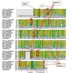 ExPASy Proteomics Tool[13] was primarily used to analyze post-transcriptional modifications of CCDC42B protein. Human CCDC42B N-terminus Acetylation (A2) corresponded in 5 out of 6 orthologs. Drosophila has no Ala, Gly, Ser or Thr at position 1–3, thus N-terminus acetylation is conserved in human CCDC42B. Human CCDC42B protein has conserved SUMOylation site, since lysine (K) at position 285 was conserved in 5 out of 6 orthologs, mostly closely related organisms showed the conservation of lysine. Phosphorylation events occur mostly in CCDC42B, which is suggested to be involved in signaling pathways. Human CCDC42B phosphorylation site of tyrosine at position 8 (Y8) was fully conserved in all 6 orthologs species (the site corresponded with sulfation site). Also other phosphorylation sites in the human CCDC42B protein were conserved in the orthologs (illustrated in the multiple sequence alignment). The same amino acid residues in human CCDC42B protein are subjected to competing phosphorylation and O-linked glycosylation.However, glycosylation sites occur mostly in serine and threonine residues that would be phosphorylated by serine/ threonine kinases. Thus, phosphorylation of the Ser/Thr residues would prevent O-GlcNAc from processing. Human CCDC42B protein has conserved GPI-modification site of Alanine (A) at position 293 that was conserved in 4 out of 6 orthologs.