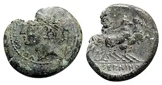 These are bronze coins presenting two types, similar in style to Roman coins of the same period: the first presents on the obverse the head of Apollo turned to the left and on the reverse a bull with a human face, to the right and with its head to the front, identical to that of the coinage of Neapoli of the same period; the second features on the obverse the head of Minerva with a Corinthian helmet and on the reverse a standing rooster.[10]