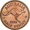 Kangaroo facing right, "AUSTRALIA" above and "HALF PENNY" below, date above denomination. Designed by George Kruger Gray. | 1939 | 1939–1952 | ||||||||