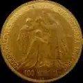 100 K | 37.0 mm | 2.0 mm | 33.9 g | 900‰ gold | "BIZALMAM AZ ŐSI ERÉNYBEN", ornament | "FERENCZ JÓZSEF I.K.A.CS. ÉS M.H.S.D.O.AP.KIR.", I. Ferenc József | "MEGKORONÁZTATÁSÁNAK NEGYVENEDIK ÉVFORDULÓJÁRA 1867-1907", coronation scene, value, mintmark | 1907 |