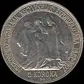 5 K | 36.0 mm | 2.6 mm | 24.0 g | 900‰ silver | "FERENCZ JÓZSEF I.K.A.CS. ÉS M.H.S.D.O.AP.KIR.", I. Ferenc József | "MEGKORONÁZTATÁSÁNAK NEGYVENEDIK ÉVFORDULÓJÁRA 1867-1907"7, coronation scene, value, mintmark | 1907[1] | |