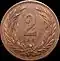 | 2 f | 17.3 mm | 1.7 mm | 2.78 g | Iron | Smooth | "MAGYAR KIRÁLYI VÁLTÓPÉNZ", Holy Crown of Hungary, year of mining | Value, mintmark | 1916 | ||