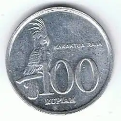 Rp 100 | 1999 | 23 mm | 2 mm | 1.79 g | Garuda Pancasila | Palm cockatoo bird and coin value | High | |
