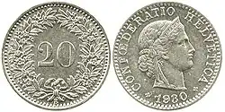 - 20 centimes: billon (15% silver, 3.25g); designed by Karl Friedrich Voigt; obv.: federal coat of arms with edelweiss and legend Helvetia, rev: numeral 20 in a wreath. Minted from 1881 in nickel (4.0g); obv: head of Liberty (by Karl Schwenzer), legend Confœderatio Helvetica. Minted since 1939 in cupronickel (Cu-Ni); pre-1938 coins were taken out of circulation in 2004.