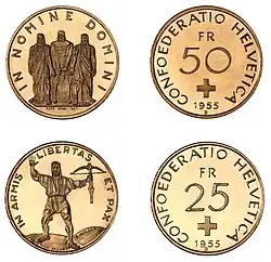 Two additional gold coins, with nominal values of 25 and 50 francs, were planned in the 1950s. The design was chosen in 1954, the 25 francs coin represented William Tell and the 50 francs coin the Rütli oath. A total of 15 and 6 million pieces of the 25 and 50 francs version, respectively, were minted in 1955, 1956 and 1959. However, in the interest of maintaining the national gold reserves, the coins were never given into circulation and remained the property of the Swiss National Bank. In a press release of February 2009, it was made public that all of these coins had been melted back into bars except for a remainder of 20,000 coins of each type and year (for a total of 120,000 surviving pieces).[15]