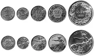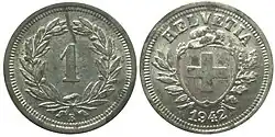 The 1 franc coin was 5.0g of 90% silver; obv: seated Helvetia (by Friedrich Fisch), rev: "1 Fr." in a wreath. In 1860 debased to 80% silver, design changed to obv: standing Helvetia (by Albert Walch). 1875–1967 83.5% silver, from 1968: Cu–Ni (4.4g).