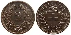 - 2 centimes: bronze (2.5g), replaced with zinc (2.4g) in 1942; designed by Alexander Hutter; obv: Swiss coat of arms with liberty cap and the legend Helvetia, rev: numeral 2 in a wreath. Minted again in bronze in 1948 (3.0g); redesigned by Josef Tannheimer, obv: Swiss cross with legend Helvetia, rev: numeral 2 and an ear of corn. Taken out of circulation in 1978.