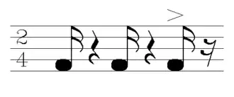 In this variant of coladeira the bass line marks the first and the last quarter-beats of the bar.