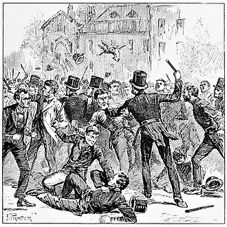 The police had orders to wait until the speakers began, before they broke up the crowd, so that the event could be confirmed positively as a NUWC meeting.[11][13] Contemporary reports disagree on whether the police drew their batons before or after being attacked by the crowd.[9] The police reported that the event was attended by "the lowest classes" who had armed themselves with knives, improvised lances, brickbats and cudgels.[6][11] By one contemporary press report many of the police were drunk.[9][11] It is known that Rowan led several baton charges against the crowd who threw stones at the police.[12] Within five minutes of taking action the police had dispersed the crowd and arrested the leaders of the meeting, including James Lee, one of two men who addressed the assembly.[11][14] The police made 21 arrests and a correspondent for the Times estimated that 50 civilians had been wounded.[14]